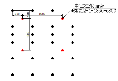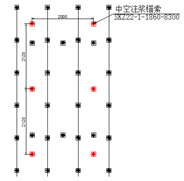 巷道顶板中空注浆锚索按3-3形式与初次支护锚索“插空”布置,排距为2.0m,间距为2.12m,锚索方向与巷道岩面垂直;巷道两帮中空注浆锚索按2-2布置,排距为2m,间距为1.6m。详见下图。